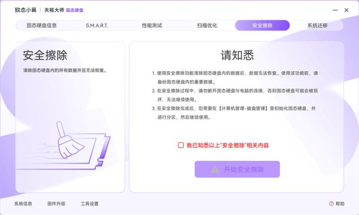 安全擦除功能可以彻底的抹除SSD中全部的数据,类似机械硬盘的全盘写零或低级格式化操作,对于有数据保密需求的用户,这个功能可以安全可靠的销毁数据。