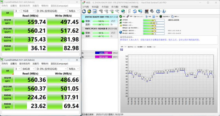 在室温约24度时,待机状态下致态小翼S001 1TB SSD温度在32度左右,在高强度进行连续读写操作后,最高温度也只有44度。