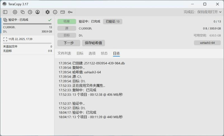 最终的平均写入速度为406MB/s,校验时读取速度平均为440MB/s。