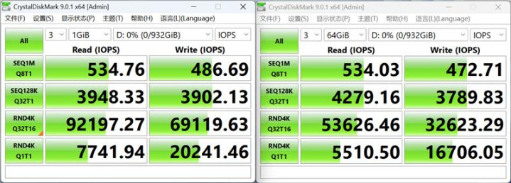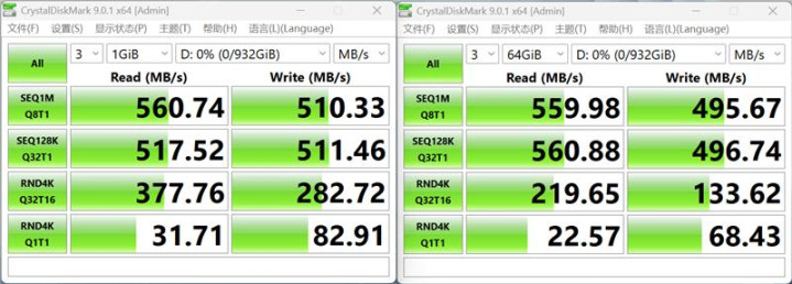 在CrystalDiskMark测试中,致态小翼S001 1TB SSD的顺序读速560MB/s,写入速度也有510MB/s;4K读写速度分别超过36MB/s和82MB/s,在64GB测试中表现也没有明显变化。