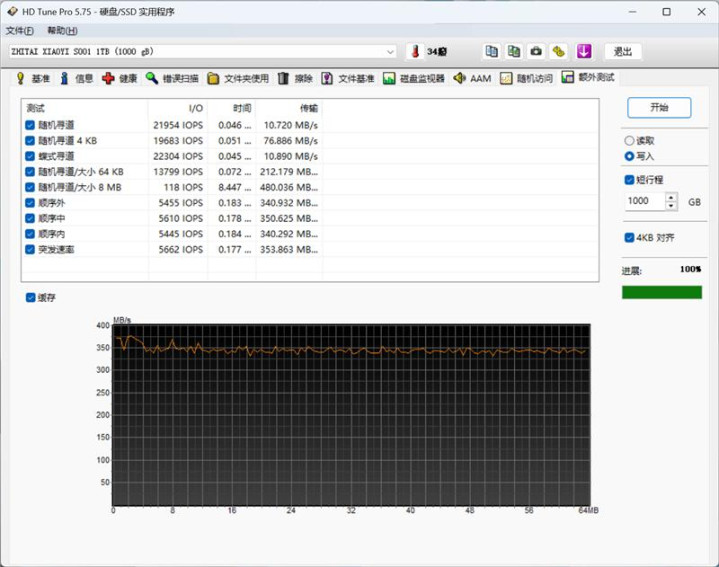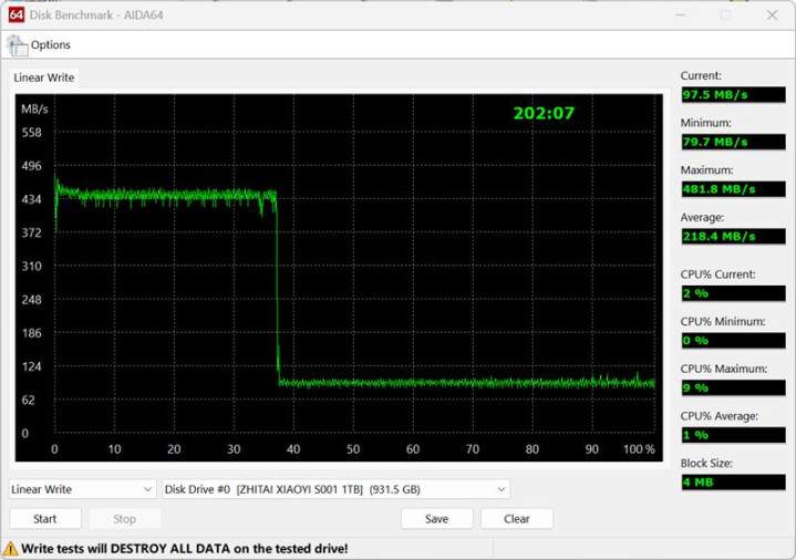 AIDA64磁盘测试中的线性写入测试,是在不依赖文件系统时,向SSD中写入数据,一直到写满为止,可以测试SSD在缓存耗尽之后的真实性能。