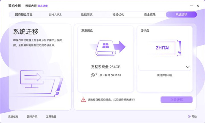 新版致态天枢大师软件中还有系统迁移功能,方便玩家将原有系统完整迁移至新SSD中,特别适合还在使用机械硬盘的老电脑将系统直接迁移至SSD中,之后就可以无缝切换,无需重装系统重新安装驱动,非常易用。