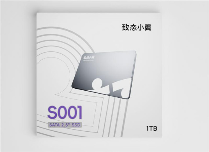 致态小翼S001 SSD的包装采用了浅色设计,白色的纸盒上印有紫色的S001型号和SATA 2.5“ SSD规格,中间是产品本体的图像,右上角有致态小翼的品牌,右下角是1TB的容量标识。