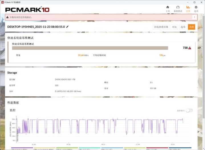 PCMark 10快速系统盘基准测试得分738分,带宽91MB/s、平均存取时间176微秒。