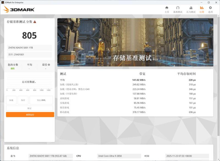 虽然现在应该不会有玩家把游戏安装在SATA SSD中,但我们也测试了一下致态小翼S001 1TB SSD在3Dmark中的磁盘性能,最终致态小翼S001 1TB SSD的得分为805分,移动游戏的速度为378MB/s,在SATA SSD中这个表现称得上极佳。