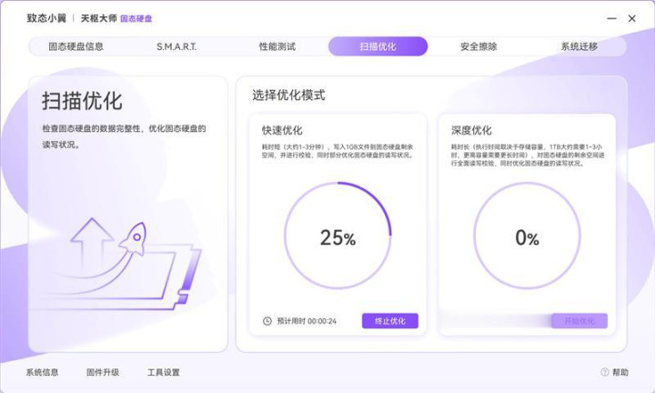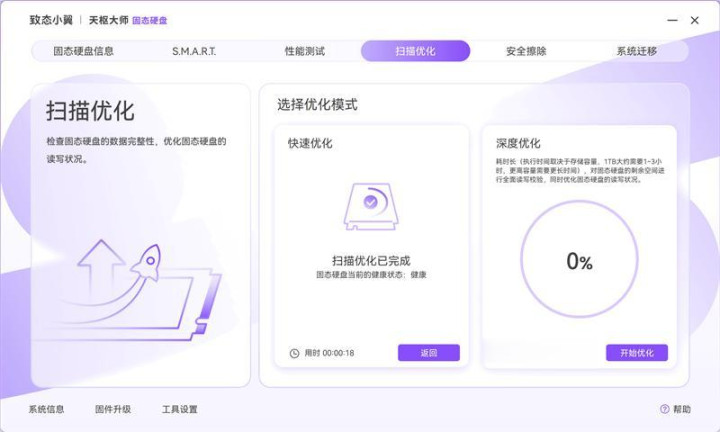 致态天枢大师软件中提供了快速优化和深度优化两种优化方案,用户可以根据自己的具体使用情况选择,由于时间关系我们就用快速优化功能对致态小翼S001 SSD进行了一轮优化,再加上目前致态小翼S001 SSD还是基本全新的空盘,快速优化仅用时18秒。