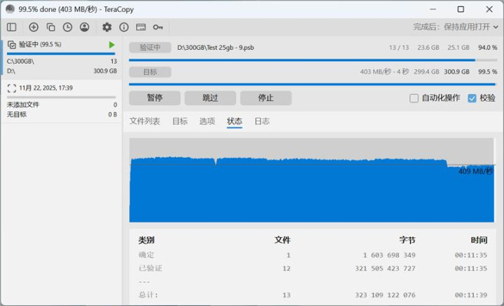可以看到致态小翼S001 1TB SSD在300GB文件写入过程中保持较为平稳的速度,没有剧烈的波动,校验是读取速度也十分平稳,只在最后结尾时略有下降。