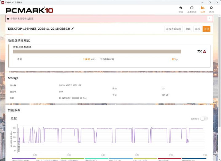 考虑到今天用户应该也不会把系统安装在SATA SSD中,我们也进行了数据盘基准测试,致态小翼S001 1TB SSD的得分为750分,测试带宽为114MB/s,平均存取时间为213毫秒。