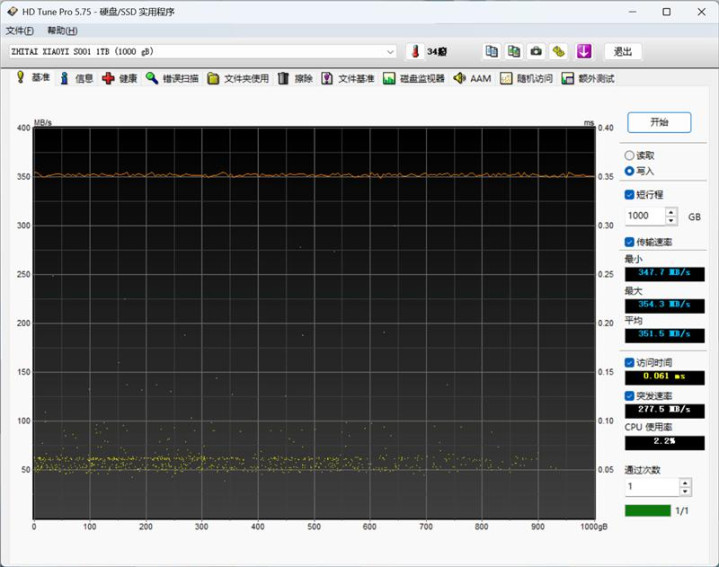 在HD Tune Pro的磁盘基准测试中,致态小翼S001 1TB SSD平均传输速度为354.5MB/s,突发速率为277.5MB/s,访问时间为0.061ms。