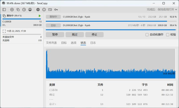 我们准备了300GB的文件,拷贝至致态小翼S001 1TB SSD中,测试实际使用中的性能表现。